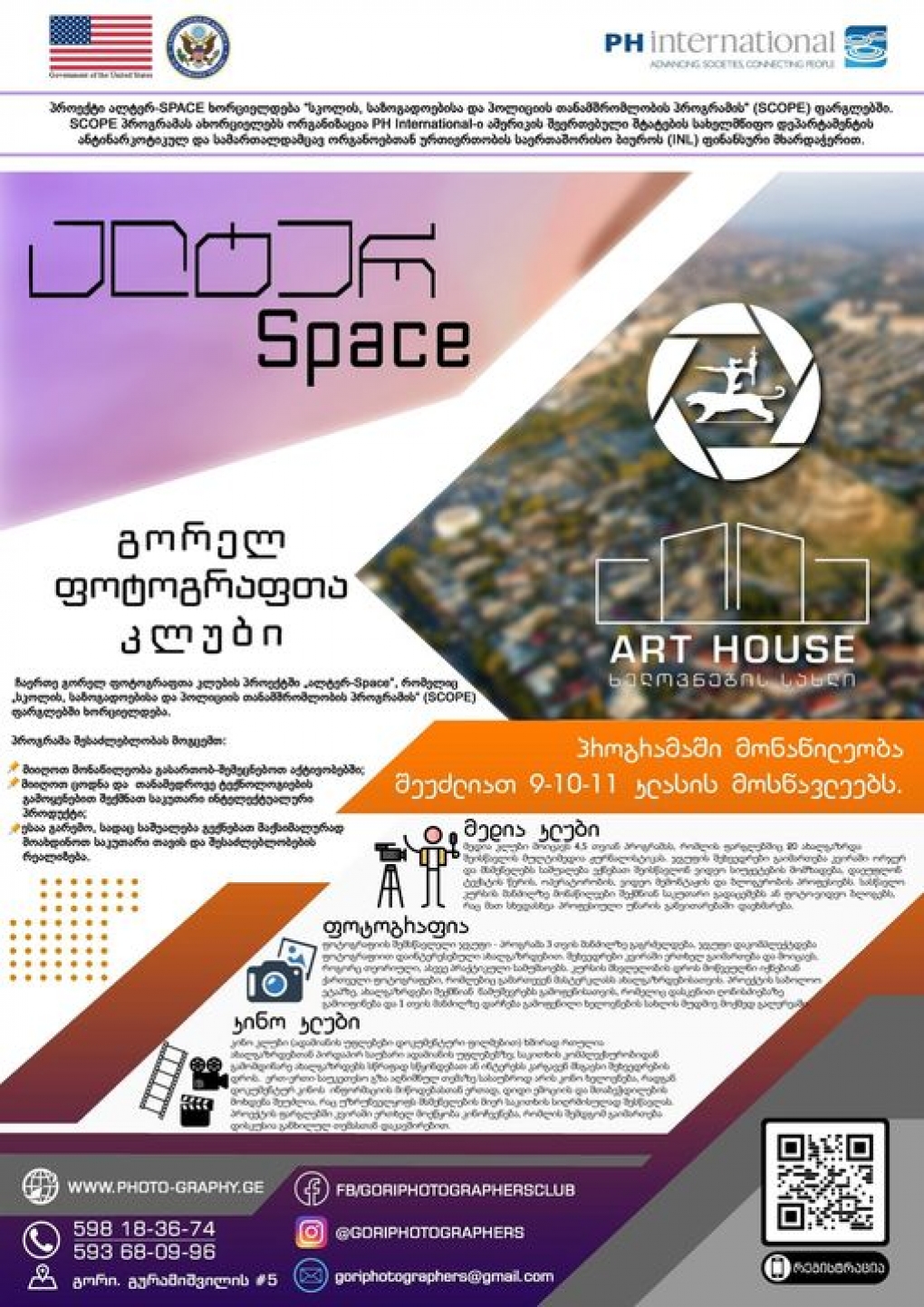 ჩაერთე გორელ ფოტოგრაფთა კლუბის პროექტში "ალტერ-Space", რომელიც ხორციელდება “სკოლის, საზოგადოებისა და პოლიციის თანამშრომლობის პროგრამის” (SCOPE) ფარგლებში.